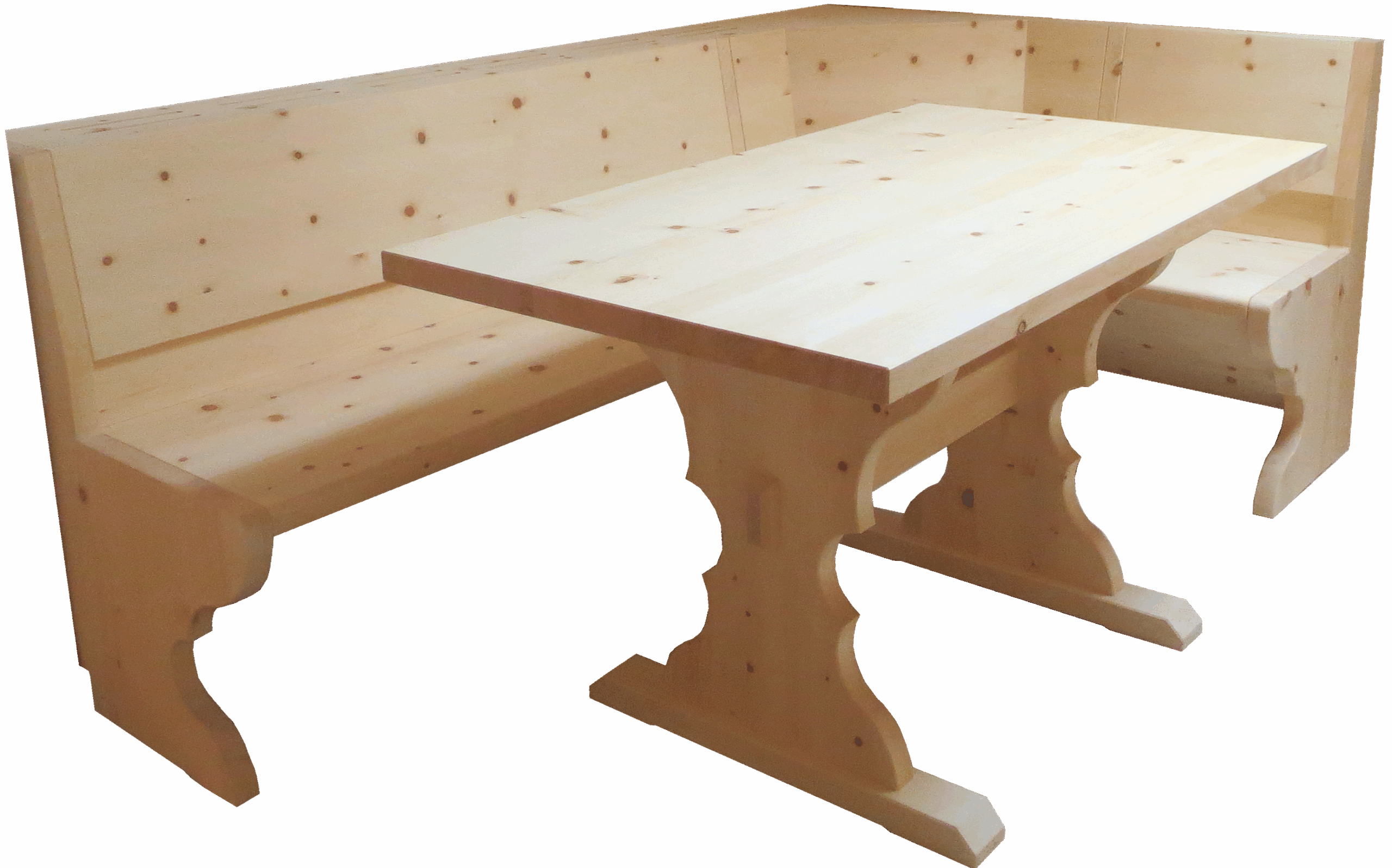 Eckbank Modell ERTAS mit glatter Rückenlehne, 45 Grad Ecke, und geschweiften Konsolen. Ganze Eckbank in Arvenholz massiv in L-Form passend zu Tischgrösse 120x80cm. Variante Links oder Rechts. Eckbankgrösse 183x153cm, Höhe 85cm, Sitzhöhe 45cm. Ganze Eckbank zusammensetzbar (zerlegt geliefert)
