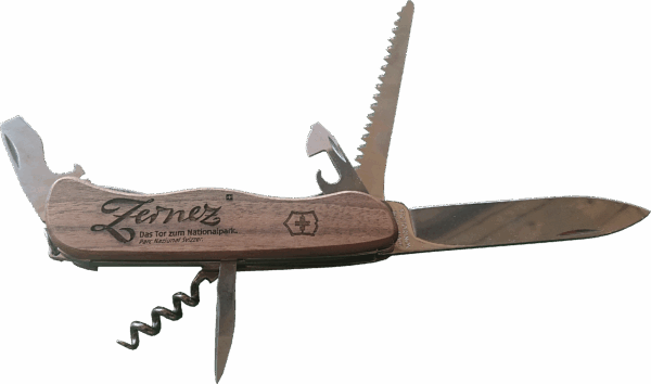 Sackmesser Modell Zernez mit Nussbaumschalen und Lasergravur Zernez