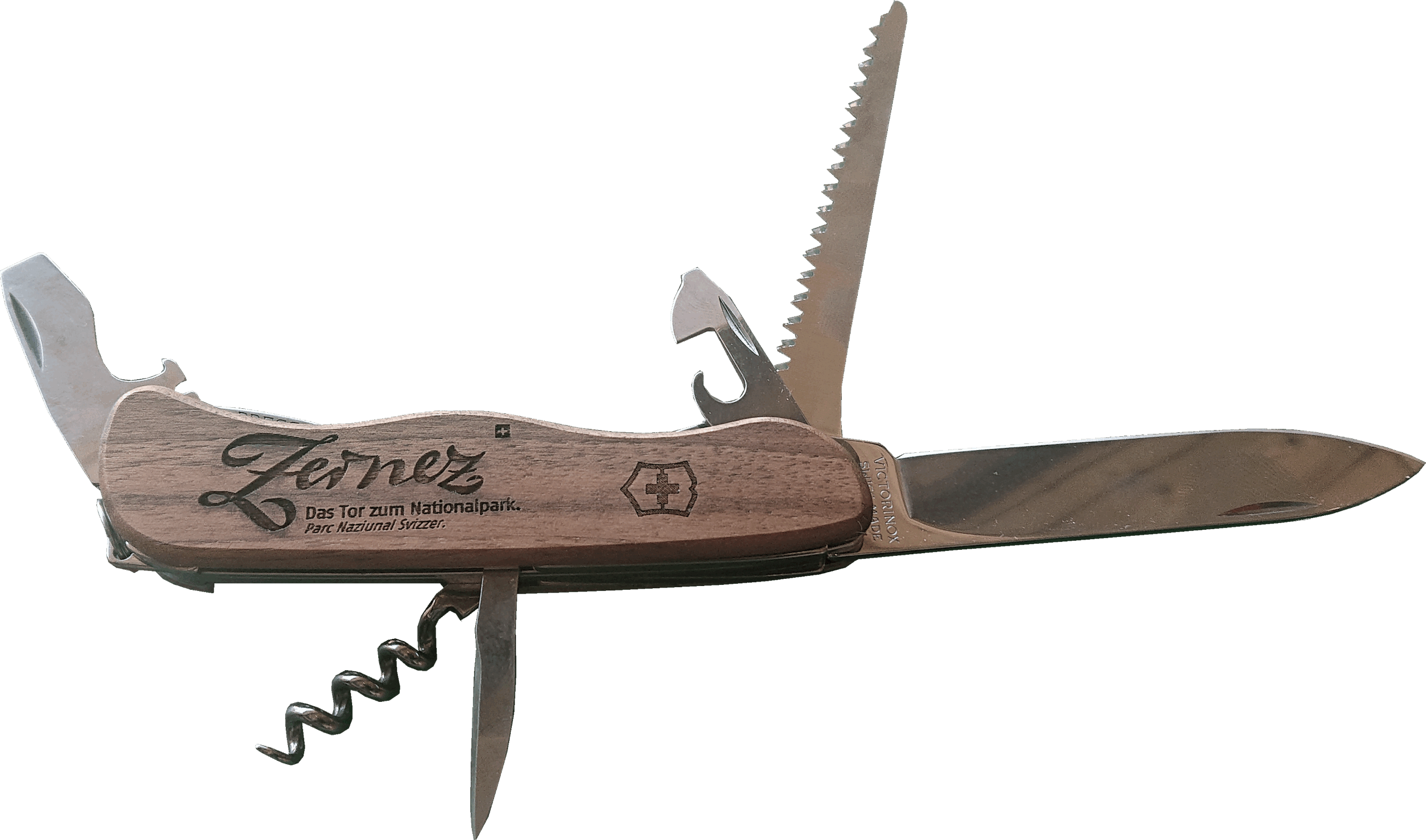 Sackmesser Modell Zernez mit Nussbaumschalen und Lasergravur Zernez